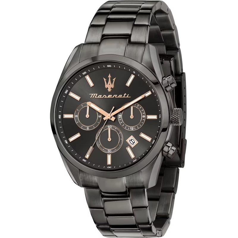 Марка: Maserati; Коллекция: Attrazione; Код продукта: R8853151001; Тип статьи: Наручные часы; Род: Мужчина; Функции > Многофункциональный: Время, Дата, Хронограф, 24 часа; Тип движения / Механизм: Кварц SEIKO VD33 (Аккумулятор); Форма Корпуса: Круглый; Материал корпуса: Нержавеющая Сталь; Цвет корпуса: Темно-серый; Диаметр Корпуса Ø: 43 mm; Тип циферблата: Аналоговый; Цвет циферблата: Черный; Материал ремешка: Нержавеющая Сталь; Цвет ремешка: Темно-серый; Стойкость к воде: 50 метров - 5 бар.